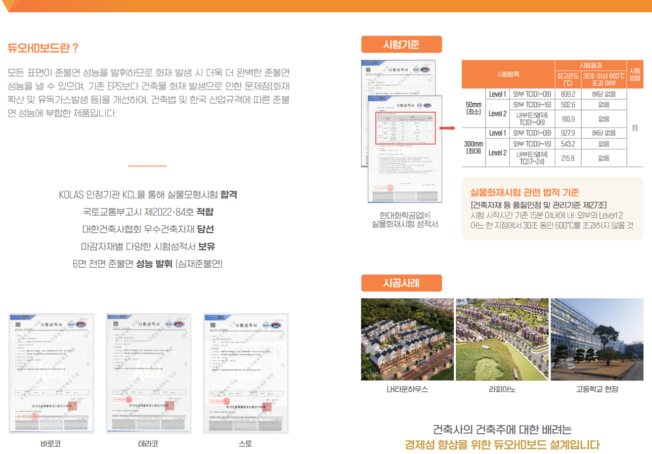 EPS 수지에 불연성의 무기물을 특수 처리한 제품으로서 기존 EPS 보다 건축물 화재 발생으로 인한 문제점(화재확산, 유독가스 발생 등)을 개선하여 건축법 및 한국 산업규격에 따른 준불연 성능에 부합한 제품입니다.